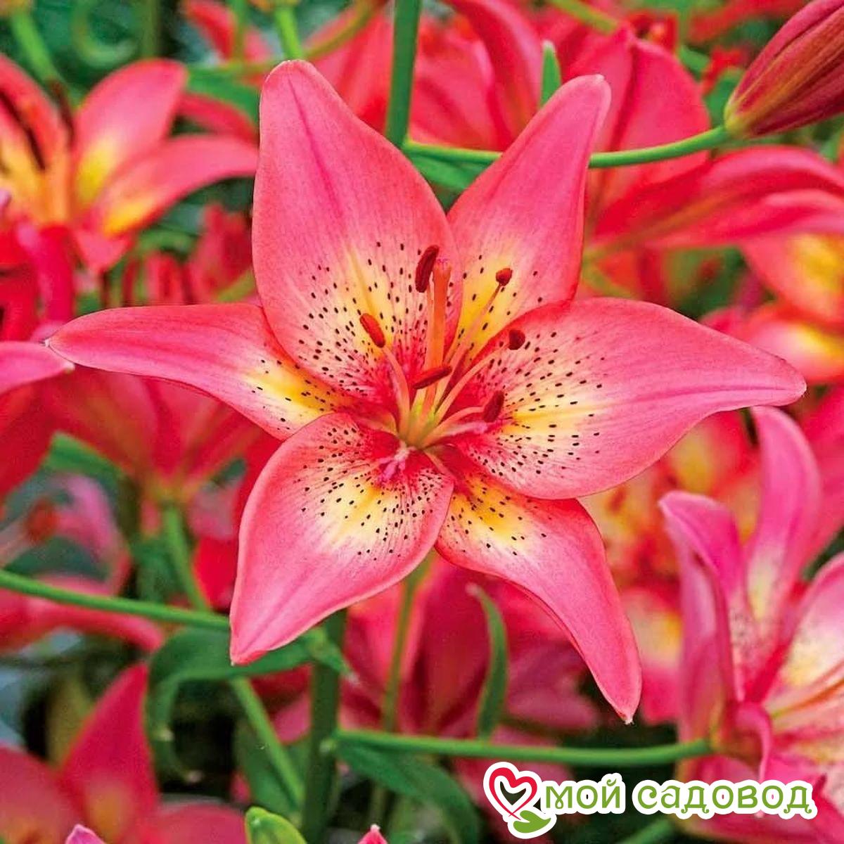 Цветы розового цвета, у горла пастельно-желтые пятна с темными вкраплениями. Без аромата. Диаметр цветка 15 см. Период цветения: июнь/июль. Высота растения достигает 100 см. Сорт достаточно неприхотлив и морозоустойчив. Уход за лилиями включает в себя прополки, поливы, рыхления, подкормки, борьбу с болезнями и вредителями. Поливают лилии в период цветения, поддерживая почву в увлажненном состоянии. Чтобы избежать пересыхания и перегрева почву мульчируют перегноем или торфом слоем в 5-6 см. Лилии хорошо отзываются на подкормки. Первую подкормку проводят весной после схода снега, разбрасывая по поверхности почвы азотные удобрения. Во время бутонизации растения поливают растворенной в воде аммиачной селитрой, непосредственно перед цветением использую фосфорно-калийные удобрения в жидком виде, в конце лета, но не позднее середины августа, лилии подкармливают фосфором и калием. Выращивать лилии на одном месте дольше 3-4 лет крайне нежелательно: луковица нарастает, становится рыхлой, растениям становится тесно по соседству. На 5 -6 год заметно снижается высота цветоноса, количество бутонов и значит, луковица истощена, а это может привести к заболеваниям и гибели растения. Осенью, когда надземная часть растения отмерла, стебель обрезают на высоте 15 см от поверхности почвы, гнездо выкапывают целиком, отделяют от материнской луковицы детки и высаживают их на доращивание. Саму материнскую луковицу пересаживают на новое место. В нашем интернет-магазине вы сможете купить Лилии Так же возможно вас заинтересуют Лилия-дерево Пурпл Принц и Лилия (ЛО-гибрид) Пинк Хевен